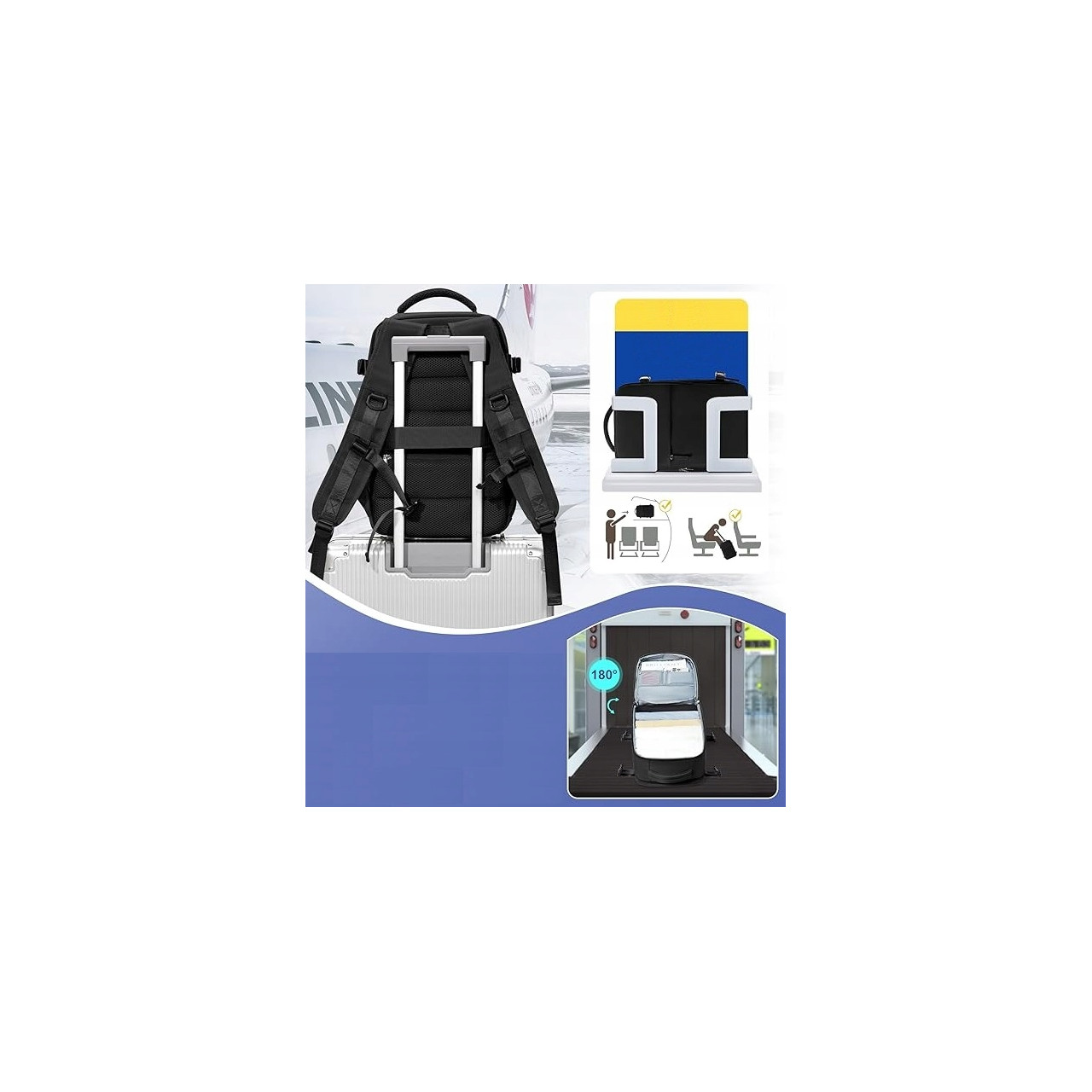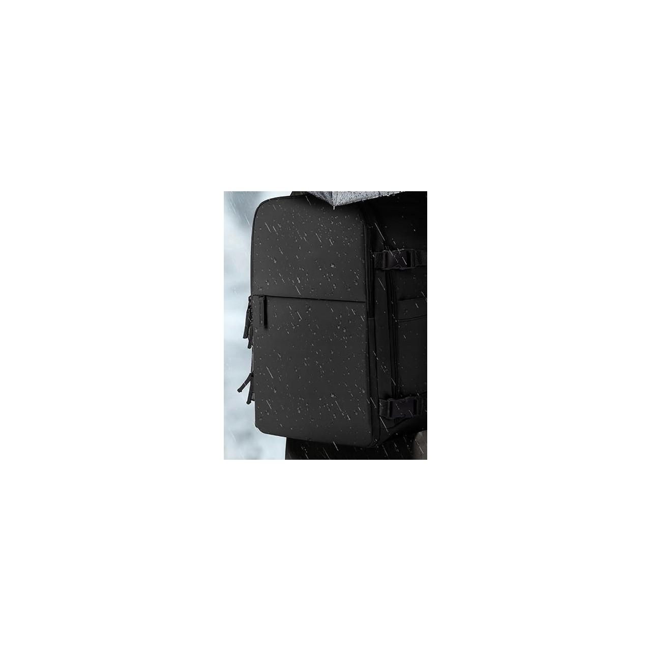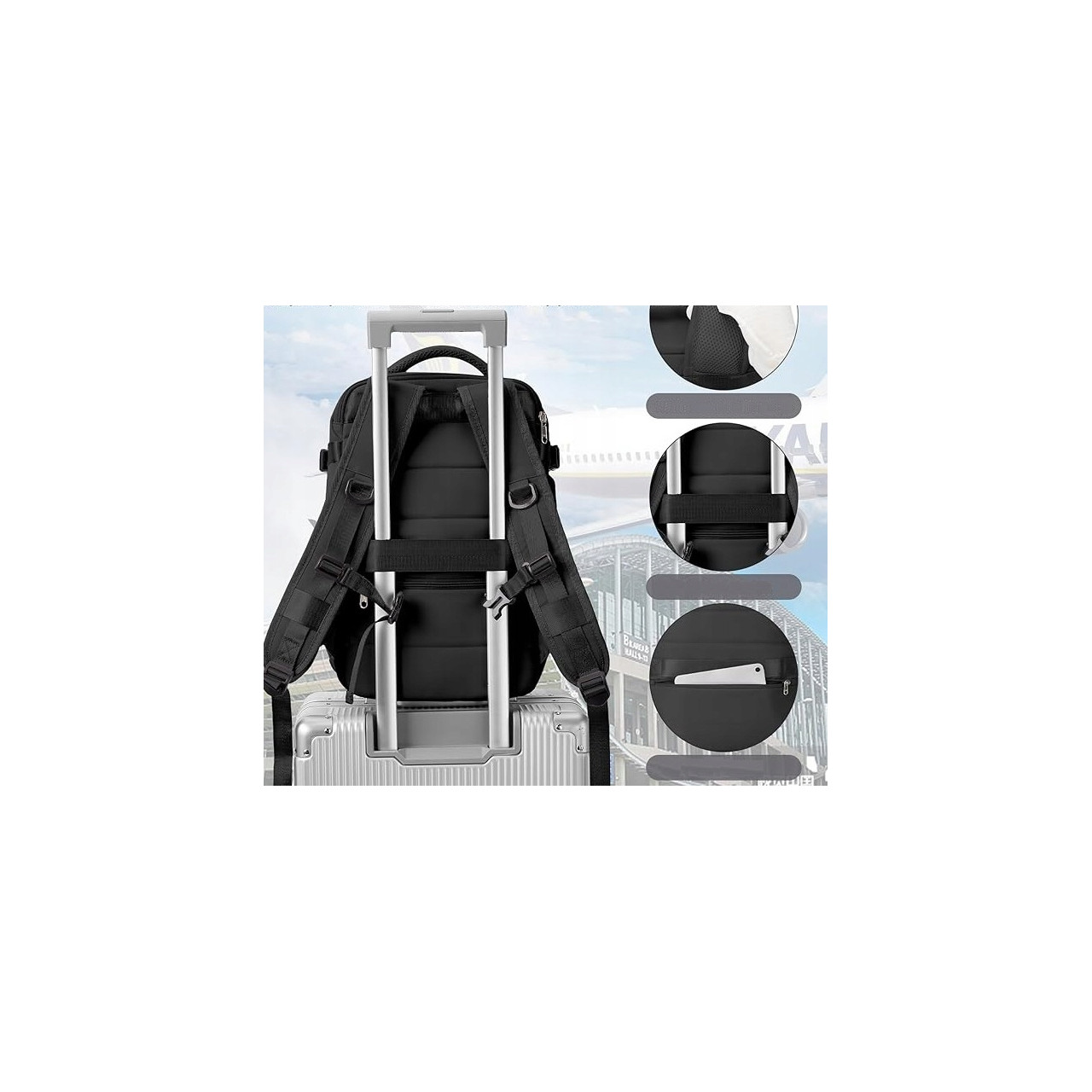 Boczne kieszenie na bidon oraz pas do walizki ułatwiają podróżowanie na lotnisku.